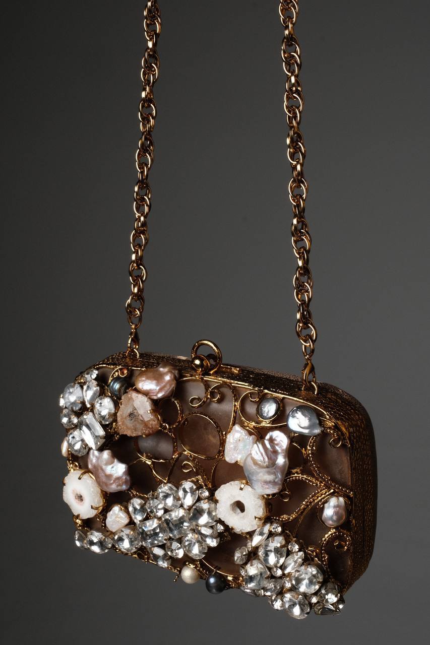 Элегантная вечерняя сумочка на длинной золотистой цепочке. Сумка декорирована крупными и мелкими камнями, жемчугом и кристаллами, что придает ей роскошный и изысканный вид. Узор из витых золотых элементов дополняет общий дизайн, создавая эффект объема и сложности. Этот аксессуар станет ярким акцентом вашего наряда и подчеркнет ваш утонченный вкус. Идеально подходит для торжественных мероприятий и особых случаев.