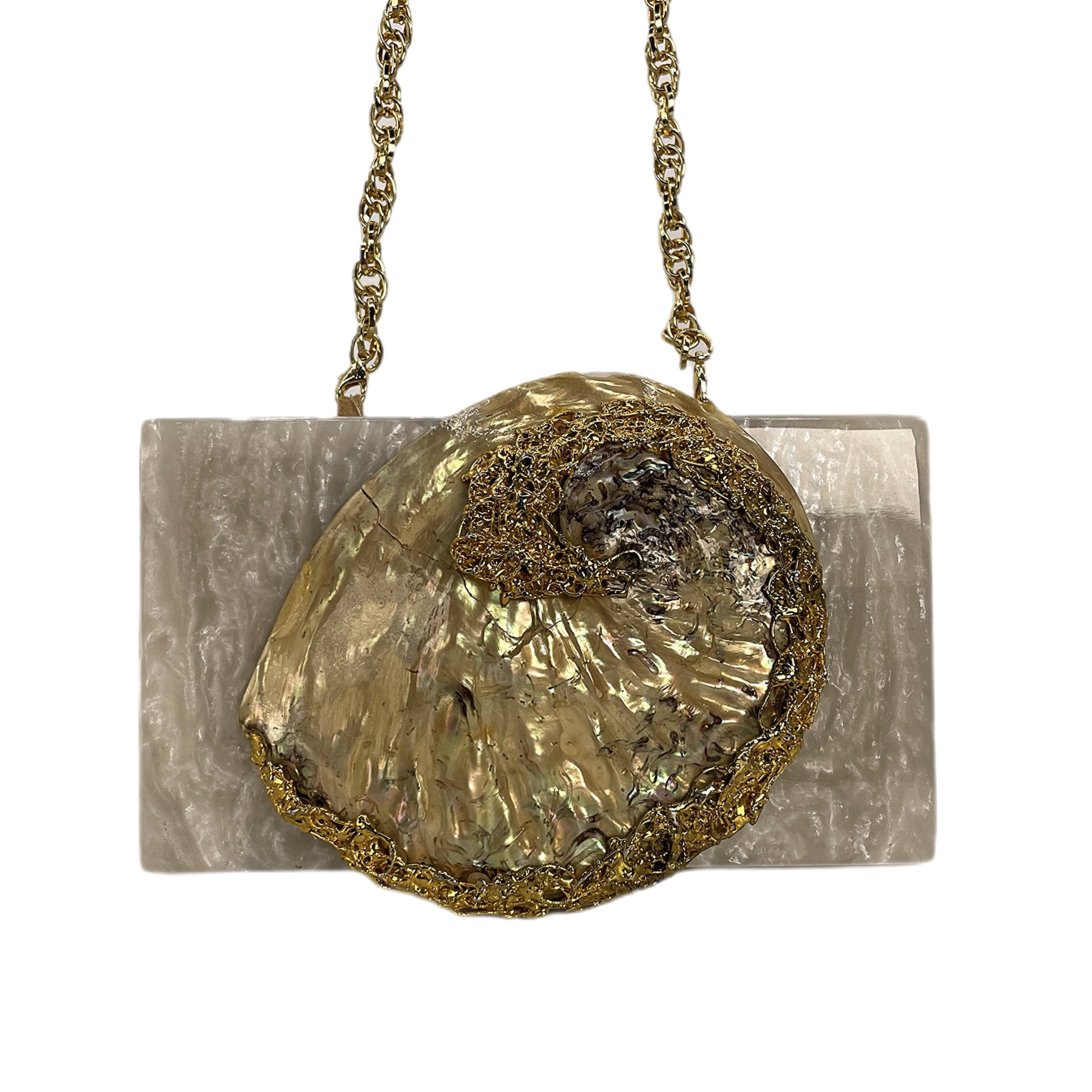 Элегантная сумочка на золотой цепочке. Украшена натуральной ракушкой с золотым узором